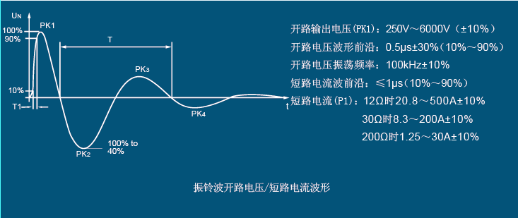 開(kāi)路電壓波形前沿(T1)(10%~90%) | PK1處0.5μs±30% | ||
