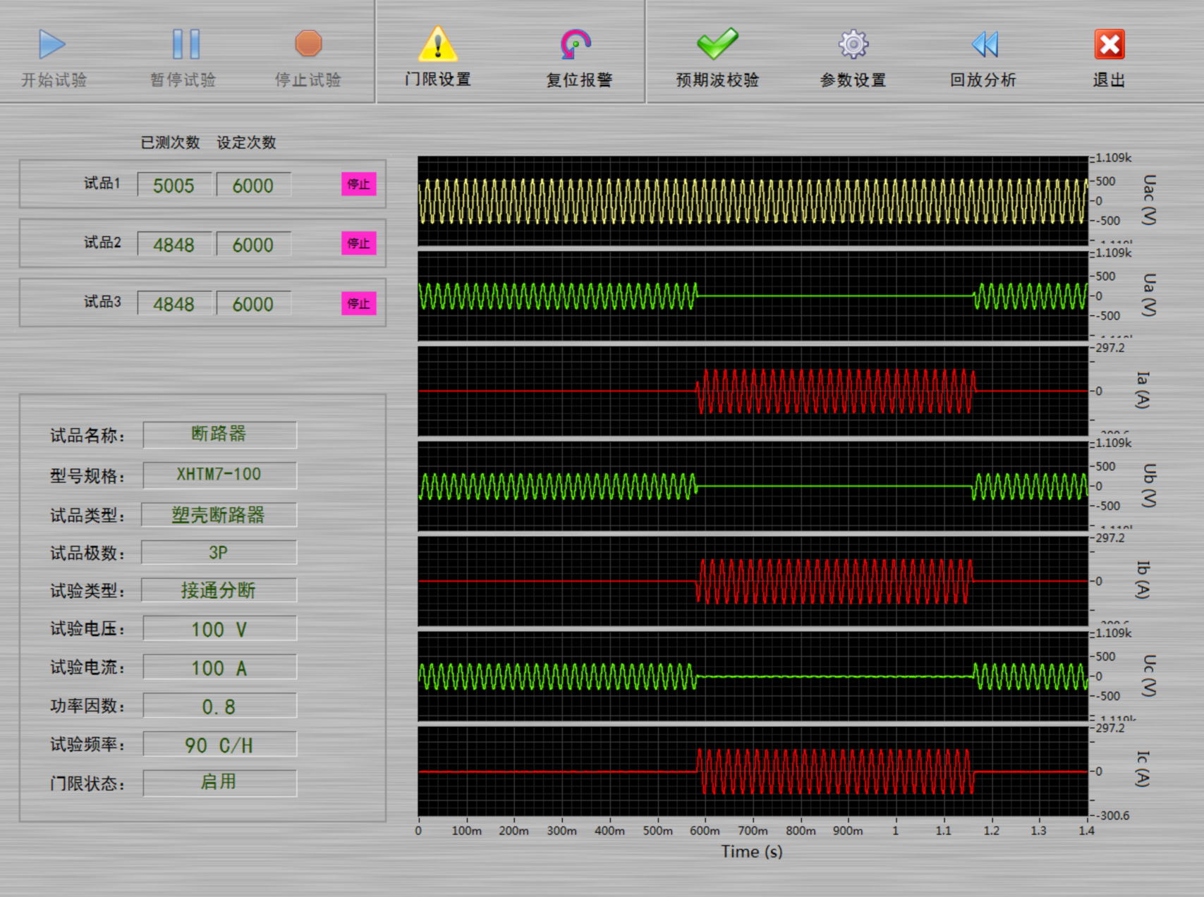 本系統(tǒng)滿足斷路器、接觸器、繼電器、車載高壓繼電器、隔離開關(guān)、雙電源開關(guān)、面板開關(guān)、插頭插座、充電樁、浪涌保護器等產(chǎn)品進行電氣壽命、接通、分斷等試驗。