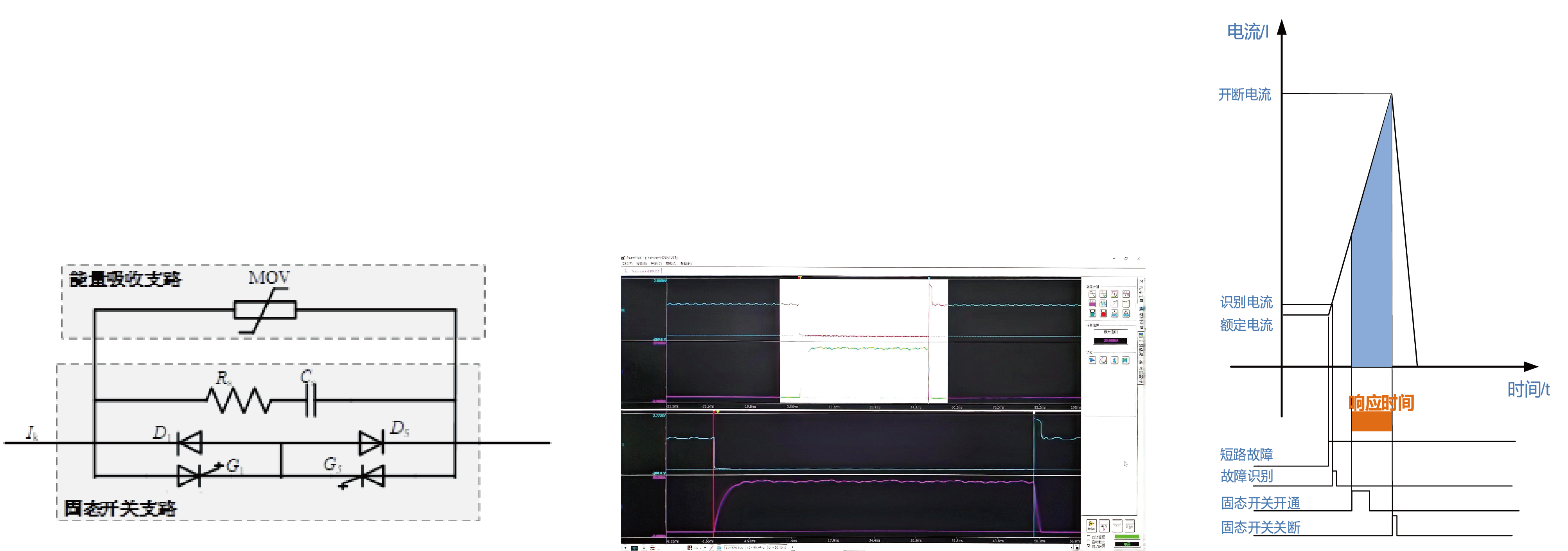 直流固態(tài)斷路器采用全固態(tài)式斷路器方案,其單相拓?fù)浣Y(jié)構(gòu)如下圖所示,包含固態(tài)開關(guān)支路、能量吸收支路及控制保護(hù)系統(tǒng)。當(dāng)系統(tǒng)正常工作時,固態(tài)開關(guān)處于導(dǎo)通狀態(tài);當(dāng)系統(tǒng)發(fā)生故障時,固態(tài)開關(guān)開斷,系統(tǒng)故障能量由能量吸收支路吸收。