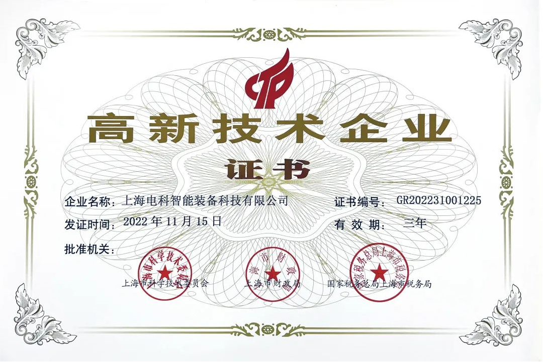 2022年11月15日,上電科智能裝備榮獲由上海市科學(xué)技術(shù)委員會、上海市財政局和國家稅務(wù)總局上海市稅務(wù)局聯(lián)合頒發(fā)的“高新技術(shù)企業(yè)”認定證書,由此上電科智能裝備正式邁入國家高新技術(shù)企業(yè)行列。