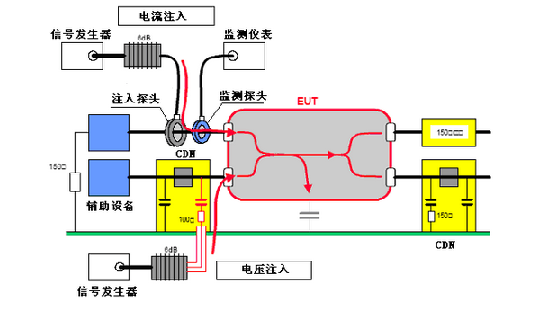 ◆ 對(duì)于低頻(150kHz-80MHz/230MHz)的射頻信號(hào),由于其波長(zhǎng)比EUT尺寸要長(zhǎng)得多,EUT的互連電纜(包括電源線和電纜線)比EUT本身更容易成為天線而接受電磁場(chǎng),因此射頻抗擾度試驗(yàn)的低頻部分,采用傳導(dǎo)測(cè)試方式更直接。針對(duì)不同類(lèi)型的電纜,可選4種注入方式:
